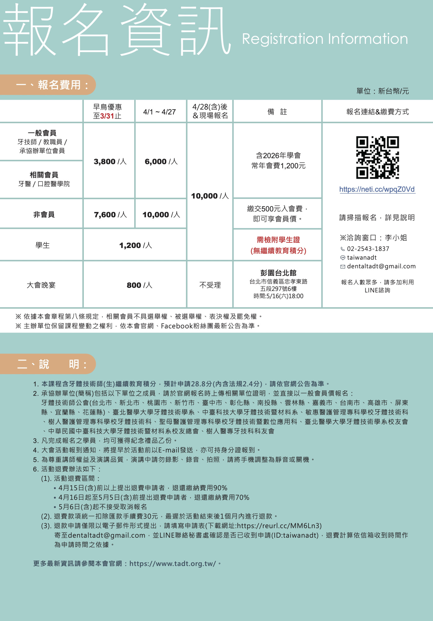 2026 Taiwan ADT 國際學術研討會早鳥報名優惠至 3 月 31 日止,歡迎於本會官網或洽各地方牙體技術師公會報名!